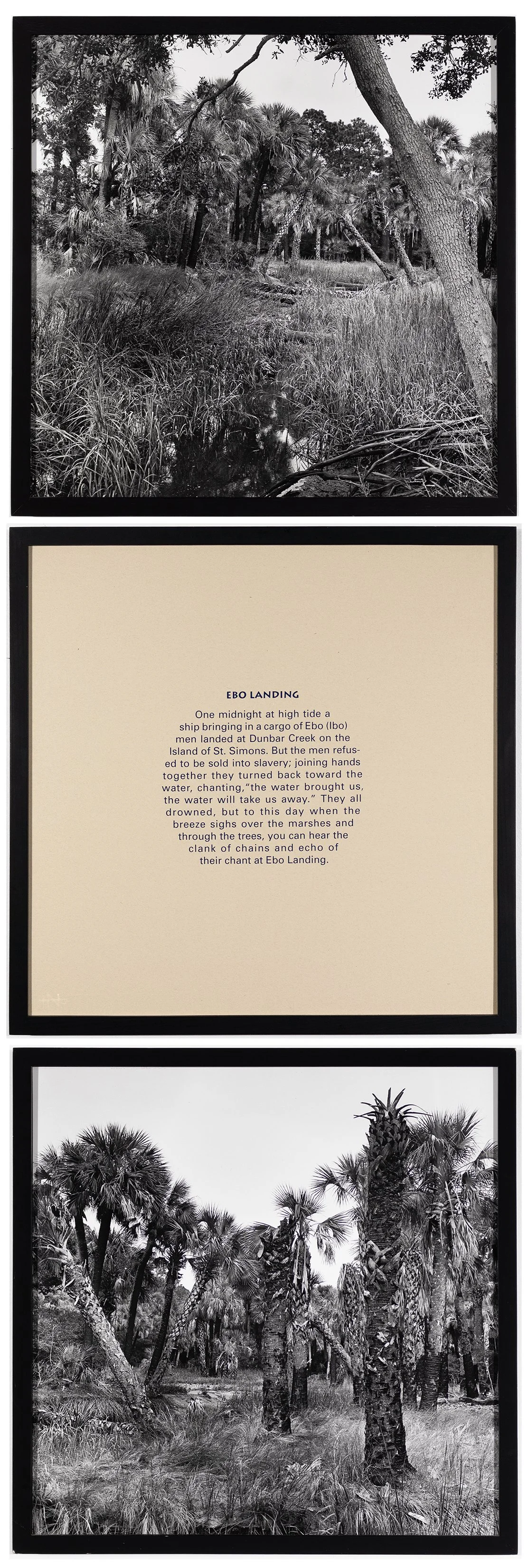 “This vertical triptych visually depicts the mythical place where Ibo men, forcibly brought to the shores of South Carolina as slaves, took part in one of the most notorious acts of resistance during the antebellum period. Weems activates this tranquil landscape by textually articulating the story of Ebo Landing. The text panel recounts the tale of a group of men that declined to be slaves and walked into the water towards a certain death rather than acquiesce to a life of captivity. Juxtaposing this folktale with silver print photographs depicting the Sea Islands of today charges the images with new meaning, importing historical knowledge and referencing centuries of oppression by displacement. Visually reinforcing the elusive meaning of the story, the fallen trees in the composition convey the notion of an uprooted life faced with an arduous future.”