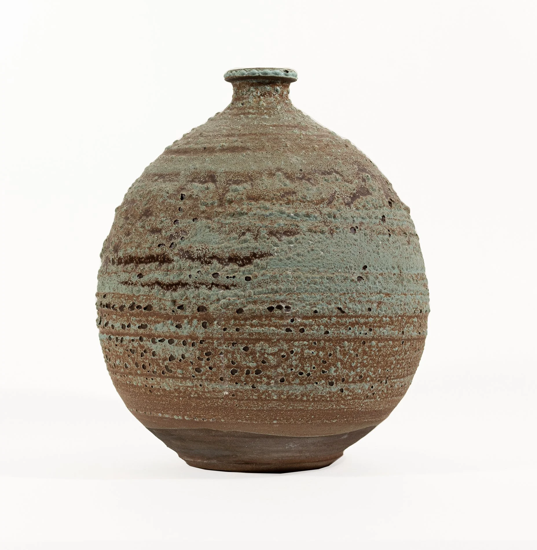 Lane was known for his innovative, bubbling glazes and weed pots, named for their tiny opening in which to place a single stem. A glaze specialist, in the Glen Lukens tradition, he developed glazes to enhance his small simple forms. They often crawl, bubble, crack and melt off the lower edges of his pieces.